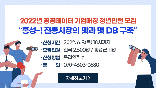 [충청뉴스큐] 홍성군은 지난 5월 9일 선정된 행정안전부, 한국지능정보사회진흥원에서 주관하는 ‘공공데이터 기업매칭 지원’사업 추진을 위해 청년인턴 11명의 일자리를 확보하고 오는 6월 9일까지 참가자를 모집한다고 밝혔다.