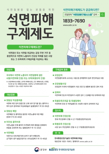 2011년부터 시행하고 있는 석면피해구제법에 따라 석면질병으로 인한 피해를 받는 사람은 요양급여, 요양생활수당, 장례비, 특별유족조위금 등을 받을 수 있다.