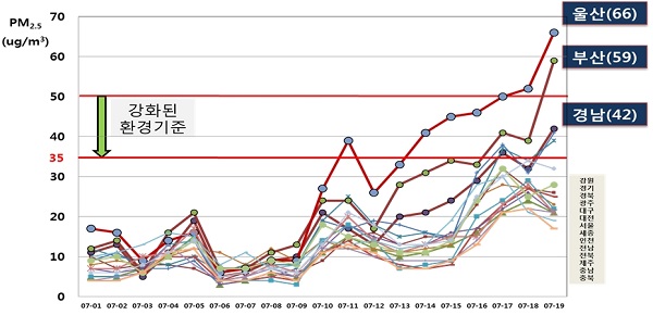 2018년 7월 전국 각 지역에서 관측된 미세먼지 PM2.5 일평균 농도를 살펴보면, 7월 10일부터 다른 지역에 비해 울산·부산지역에서 미세먼지 농도가 높게 나타나고 있다.