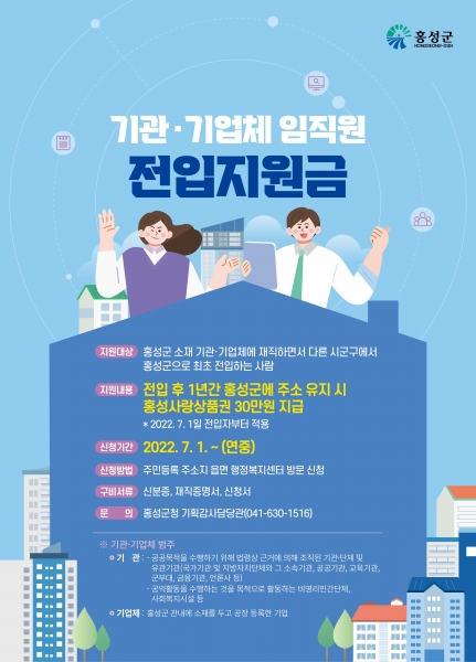 이선용 기획감사담당관은 "홍성군은 관내 기관·기업체 임직원의 안정적인 지역 정착을 응원하고 있다”며 “대상이 되는 임직원들은 전입신고 및 전입지원금을 신청해주시길 바란다”고 말했다.
