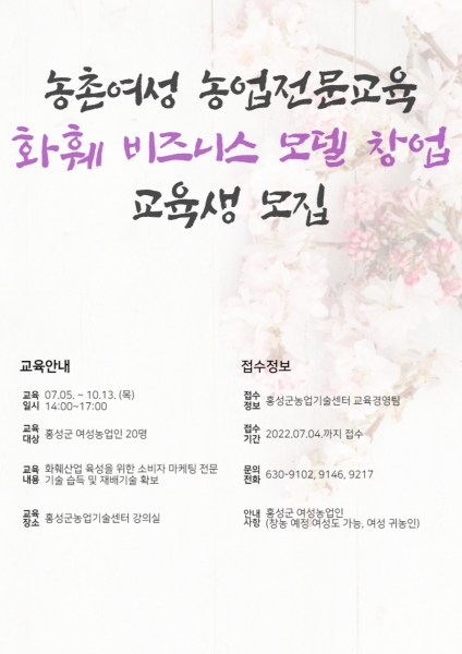 [충청뉴스큐] 홍성군농업기술센터는 오는 7월 4일까지 지역의 농촌여성을 위한 ‘화훼 비즈니스 창업 과정’의 교육생을 모집한다.