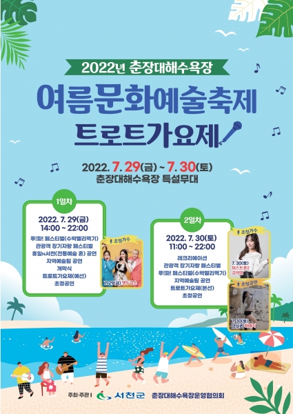본격적인 여름 휴가철을 맞아 울창한 해송과 은빛 모래 해변이 어우러진 천혜의 관광지 춘장대해수욕장에서 펼쳐지는 이번 여름문화예술축제는 ‘트로트 가요제’를 주요 테마로 1일차에는 예선전과 개막식을, 2일차에는 본선 진출자들의 열띤 경연이 펼쳐질 예정이다.