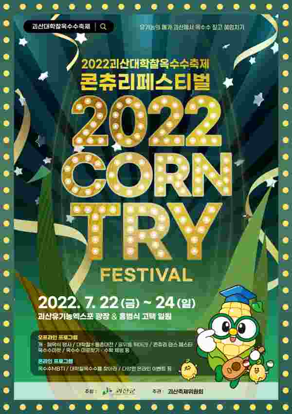 [충청뉴스큐] 충북 괴산축제위원회는 2022괴산대학찰옥수수축제 ‘콘츄리페스티벌’을 7월 22일부터 24일까지 3일간 괴산유기농엑스포광장과 홍범식 고택 일원에서 개최한다고 밝혔다.