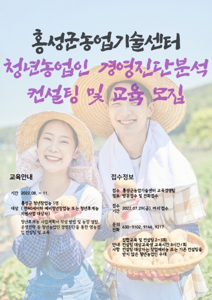 [충청뉴스큐] 홍성군농업기술센터에서 오는 29일까지 관내 청년창업농을 위한 2022년 청년창업농 경영진단분석 컨설팅에 참여할 교육생을 모집한다.