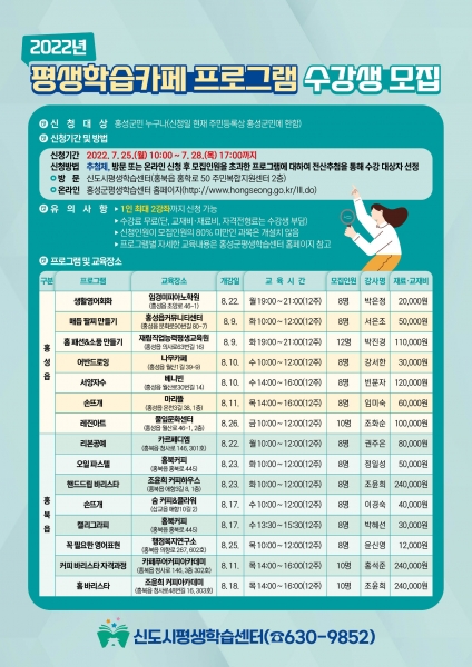 접수는 25일 10시부터 28일 오후 5시까지 진행되며 신도시평생학습센터 방문 접수 또는 홍성군평생학습센터 홈페이지에서 온라인 접수 가능하다.