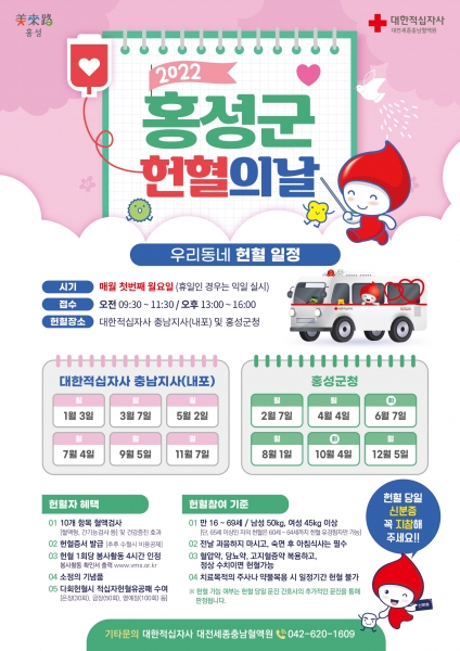 홀수 달은 대한적십자사 충남지사, 짝수 달은 홍성군청 앞에 헌혈 버스에서 오전 10시에서 오후 4시까지 진행한다.