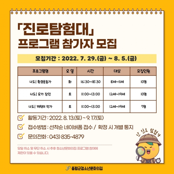 [충청뉴스큐] 증평군 청소년 문화의집은‘진로탐험대’프로그램 참가 청소년을 선착순으로 모집한다.