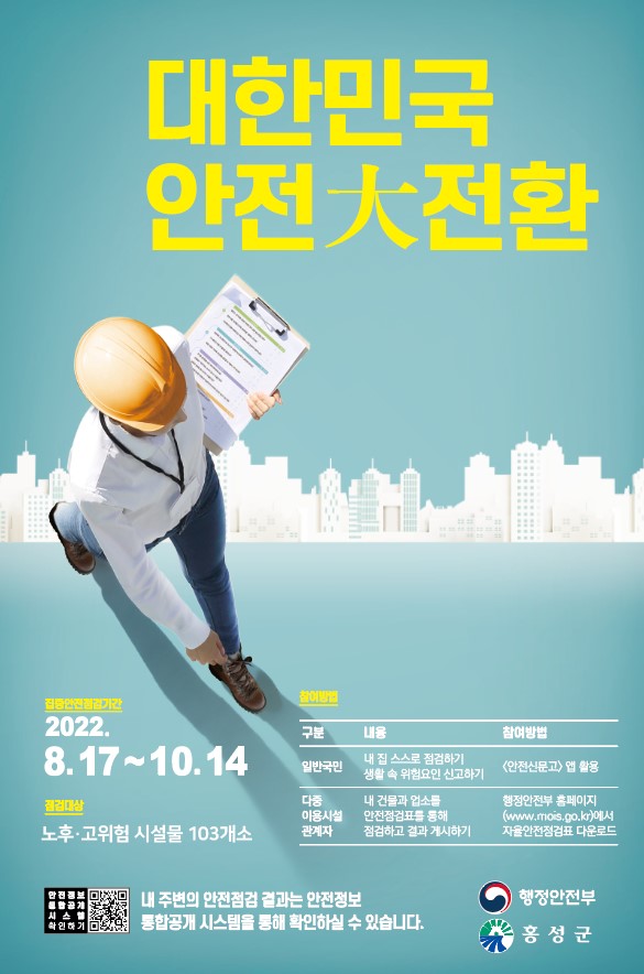 [충청뉴스큐] 홍성군은 공무원, 홍성지역건축사협회, 한국가스안전공사, 홍성소방서 민간전문가 등을 포함한 민·관 합동점검반을 편성, 오는 17일부터 10월 14일까지 ‘2022 대한민국 안전大전환을 위한 홍성군 집중안전점검’을 실시한다.