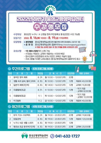[충청뉴스큐] 홍성군은 군민의 평생학습을 통한 지식충족 및 삶의 질 향상을 위해 오는 16일부터 4일간 홍성군평생학습센터와 신도시평생학습센터 양 센터에서 2022년 하반기 프로그램 수강생을 모집한다.