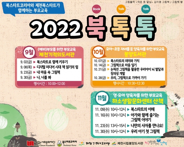 [충청뉴스큐] 제천기적의도서관은 문화체육관광부·한국출판문화산업진흥원 주최, 책읽는사회문화재단에서 주관하는 ‘2022 북스타트 부모교육 지원사업’ 수행기관으로 선정되어 9월부터 11월까지 ‘2022 북, 톡, 톡’을 운영한다.