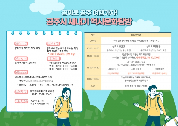 총 80명을 대상으로 실시되는 이번 탐방은 공산성, 무령왕릉, 우금티 전적지 및 제민천 근현대 유적 탐방을 비롯해 드립커피, 와인테이스팅 체험 등으로 진행되며 참가비는 무료이다.