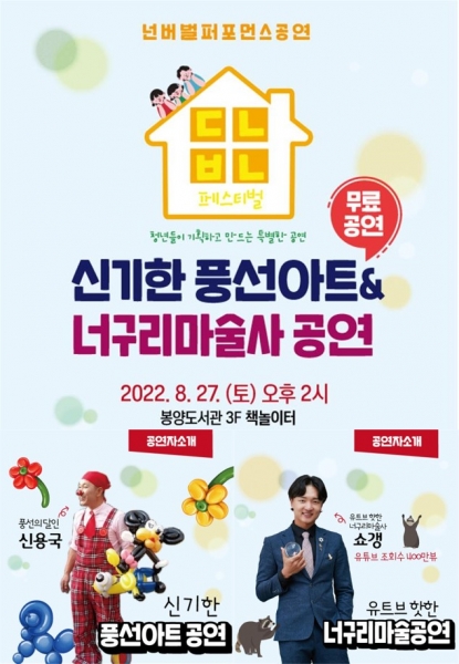동네방네 페스티벌 in 봉양 공연은 8월 27일 오후 2시부터 1시간가량 봉양도서관 3층 책놀이터에서 개최되며 신기한 풍선공연과 너구리 마술쇼 등 참여형 넌버벌 퍼포먼스 공연으로 진행될 예정이다.