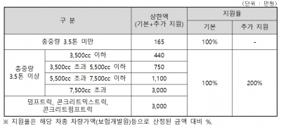 자세한 지원 금액은 보험개발원에서 발표한 분기별 차량기준가액에 따르며, 저소득층의 경우에는 지원율 10%를 추가해 상한액 범위 내에서 지원한다.