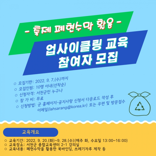 업사이클링 교육은 9월 20일부터 28일까지 매주 화요일과 수요일 오후 1시부터 4시 사이에 서천군 종합교육센터 2-1 강의실에서 진행된다.