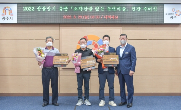 [충청뉴스큐] 공주시는 지난 29일 시청 대백제실에서 산림청이 주관한 ‘2022 소각산불 없는 녹색마을’에 선정된 3개 우수마을에 대한 산림청장 명의의 현판을 전달했다.
