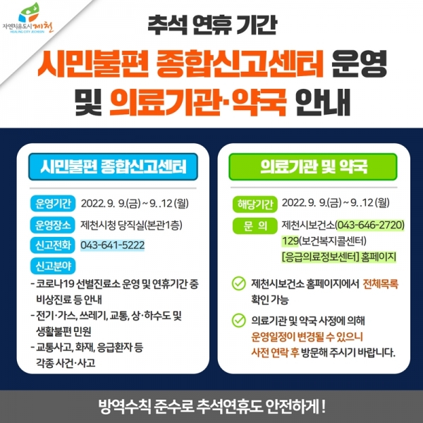 지역응급의료기관인 제천서울병원과 명지병원은 응급환자 발생에 대비해 24시간 응급실을 열고 있으며 병원 진료 및 의약품 구입 불편을 최소화하기 위해 관내 병의원 39개소, 약국 24개소가 지정일자에 진료 또는 운영하게 된다.