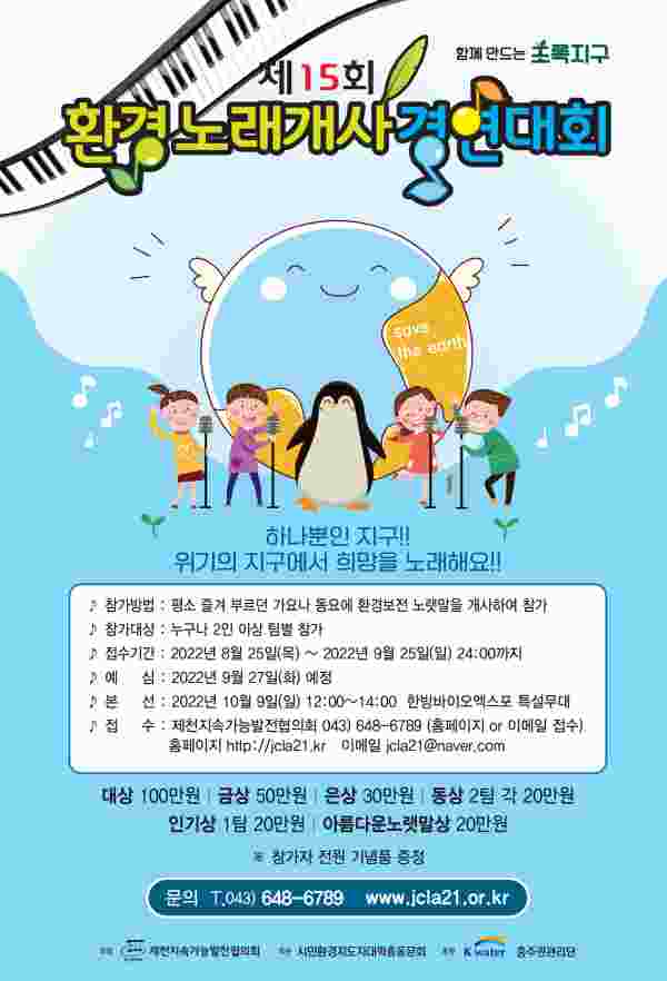 [충청뉴스큐] 제천시와 제천지속가능발전협의회는 10월 9일 2022제천한방바이오박람회와 연계해 한방바이오엑스포 특설무대에서 개최되는 제15회 환경노래개사경연대회 참가자를 모집하고 있다.