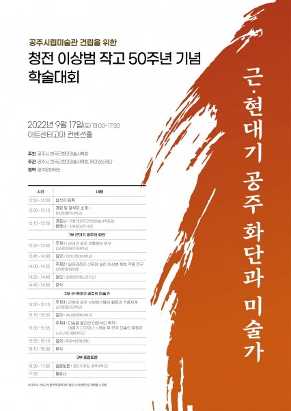 시는 공주 출신의 근대 화가 청전 이상범의 작고 50주년을 계기로 이상범뿐만 아니라 근·현대기 공주 화단과 미술가에 대한 연구성과를 공유할 예정이다.