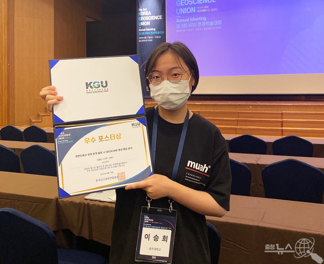 국립 공주대학교(총장 원성수) 대기과학과 이승희, 신경주 학생(지도교수 서명석)은 지난달 19일 한국지구과학연합회 개최한 제 3회 KGU 연례학술대회에서 우수 포스터로 선정됐다“고 21일 밝혔다.