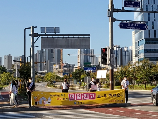 이날, 캠페인에는 군 기획감사담당관 부서와 홍북읍 직원 30여명이 참여한 가운데 미전입 세대가 많은 오피스텔 인근 출근 시간대에 전입신고 홍보문구가 새겨진 어깨띠, 피켓, 현수막을 통해 집중적으로 전입신고 안내 및 전입 시 혜택에 대해 적극 홍보활동을 펼쳤다.
