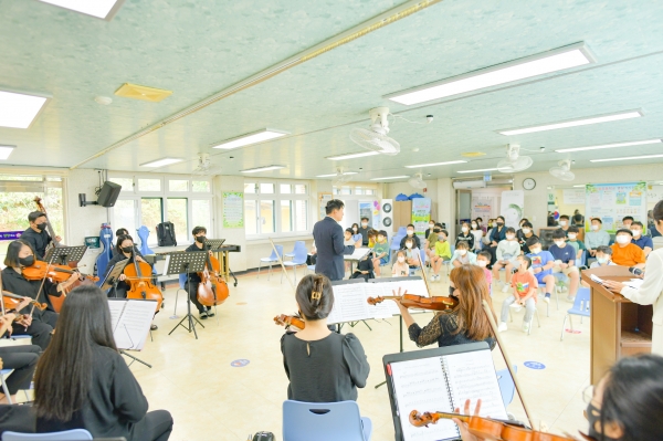 [충청뉴스큐] 홍성군립오케스트라의 ‘찾아가는 교과서 음악회’ 공연이 전교생 31명의 학생이 참여한 가운데 지난 20일 서부면 신당초등학교에서 열렸다.