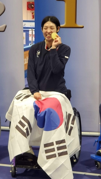 [충청뉴스큐] 홍성군 장애인직장운동경기부의 휠체어펜싱팀 권효경 선수가 사상 첫 세계대회 금메달 사냥에 성공했다.