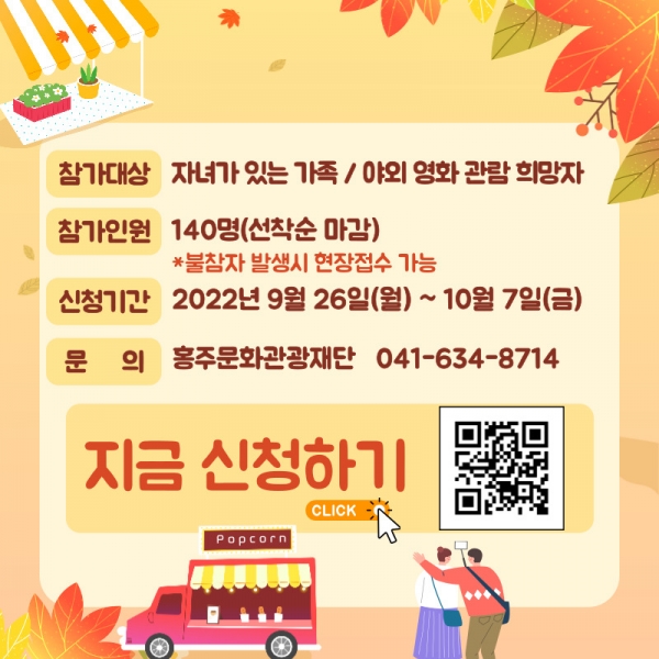 이번 행사는 다문화 가족과 자녀가 있는 가족, 그리고 야외에서 영화관람을 희망하는 주민을 우선으로 10월 14일 오후 6시 30분부터 홍성군 이응노의 집 뜰에서 열리며 아이들을 위한 보물찾기 이벤트와 다양한 경품도 마련됐다.