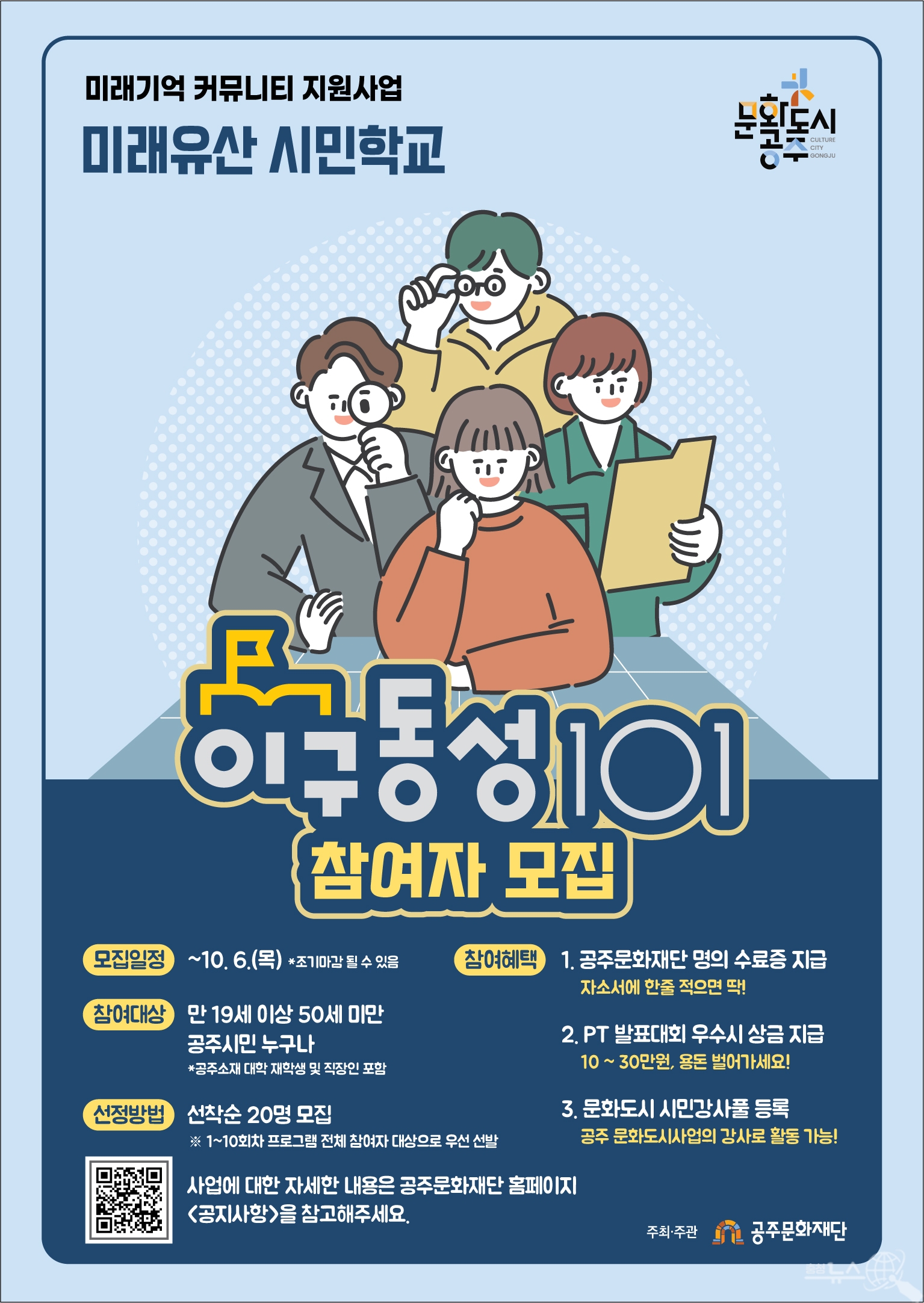공주문화재단(대표이사 이준원)은 오는 6일까지 문화도시조성사업 중 미래기억 커뮤니티 지원사업으로 미래기억 시민강사 양성 및 인력풀 구축을 위한 ‘미래유산 시민학교 <이구동성 101>’의 참여자를 모집한다“고 밝혔다.
