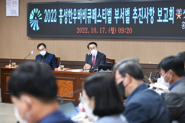 [충청뉴스큐] 홍성군은 오는 11월 5일부터 11월 6일까지 2일간 홍주읍성 일원에서 열리는‘2022 홍성한우바비큐페스티벌’의 성공적 개최를 위해 ‘홍성한우바비큐페스티벌 부서별 추진상황 보고회’를 지난 17일 개최했다.