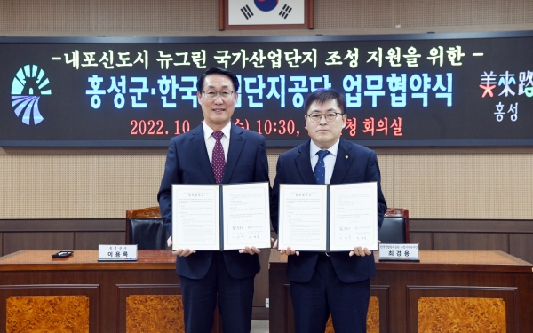 [충청뉴스큐] 홍성군은 19일 홍성군청에서 한국산업단지공단 충청지역본부와 ‘내포신도시 뉴그린 국가산업단지’조성을 위한 상호 협력 협약을 체결했다.