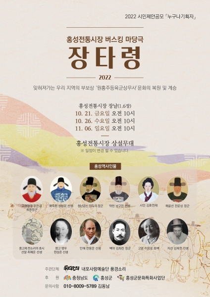 한편 2022년 홍성군 문화특화사업단의 시민제안공모‘누구나 기획자’ 사업으로 추진되는 이번 공연에 대한 자세한 사항은 내포사랑예술단 풍경소리로 문의하면 된다.