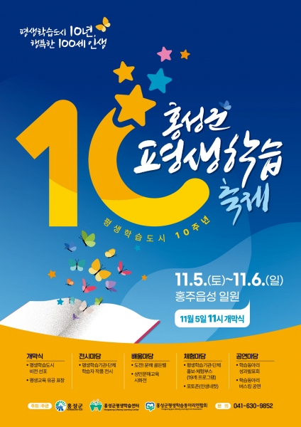 [충청뉴스큐] 홍성군은 평생학습도시 지정 10주년을 맞아 ‘평생학습도시 10년, 행복한 100세 인생’을 주제로 오는 11월 5~6일 양일간 홍주읍성 일원에서 ‘2022년 홍성군 평생학습축제’를 개최한다.