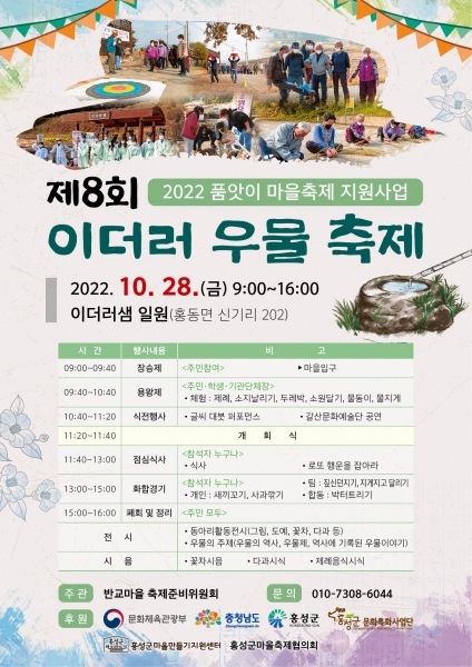 품앗이 마을축제는 홍성군 문화특화사업단에서 축제를 통한 마을 공동체 활성화 및 지역자원 활성화를 위한 공모사업으로 2022년 15개 마을을 선정해 올해 마지막으로‘제8회 이더러 우물축제’로 마무리 된다.