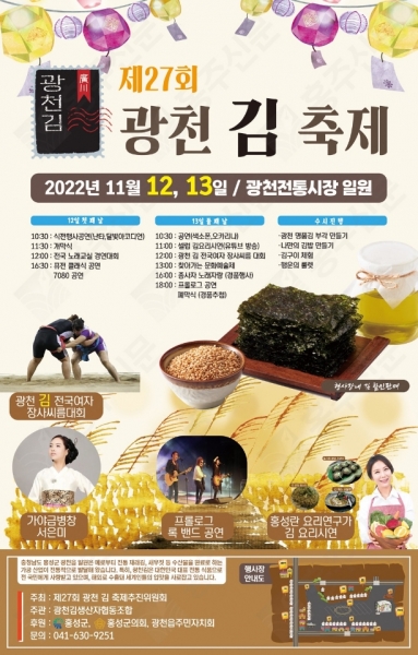 [충청뉴스큐] 홍성군을 넘어 대한민국 대표 특산품 ‘광천김’의 우수성을 알리기 위한‘제27회 광천 김 축제’가 오는 11월 12일 오전 10시 30분 광천전통시장 일원에서 열린다.