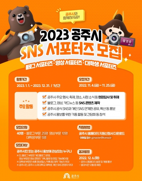 서포터즈로 위촉되면 2023년 1년간 공주시 주요행사 및 축제, 명소 등 현장 답사 및 취재 블로그, 영상, 카드뉴스 등 SNS 콘텐츠 제작 공주시 공식 SNS와 개인 SNS 연계 홍보 등의 활동을 하게 된다.