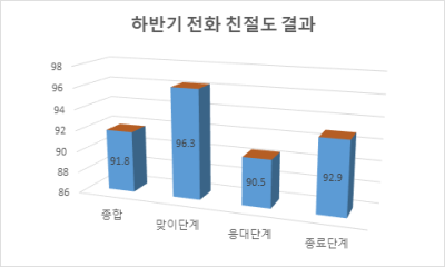 이번 전화 친절도에서는 상반기 90.6점 대비 1.2점이 상승해 직원들의 전화응대 친절도가 소폭 향상된 것으로 평가됐다.
