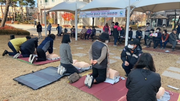 훈련은 지진 발생상황을 가정해 실내 방송을 통한 상황전파, 대피 유도, 대피 완료 후 상황별·장소별 행동 요령 교육 및 홍성군 지진 옥외대피장소 안내지도 배부, 홍성소방서 현장대응단의 참여형 심폐소생술교육 순으로 진행됐으며 주민들의 적극적인 참여로 성황리에 마무리됐다.