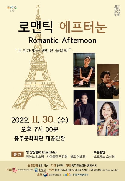 [충청뉴스큐] 홍성군 홍주문화회관이 늦가을 정취와 잘 어울리는 토크가 있는 편안한 음악회 “로맨틱 에프터눈”을 오는 11월 30일 오후 7시 30분에 개최한다.