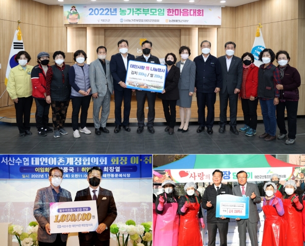 NH농협중앙회 태안군지부도 이날 농협 군지부 대회의실에서 가세로 군수와 조합장 등 100여명이 참석한 가운데 기탁식을 갖고 김치 50상자 및 쌀 20포를 전달했다.