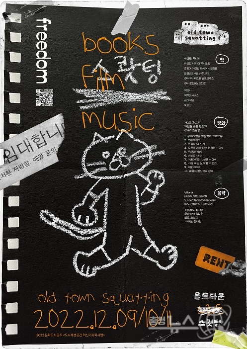 (재)공주문화재단(대표이사 이준원) 문화도시센터는 오는 9일부터 11일까지 원도심 유휴공간을 음악-책-영화로 채우는 게릴라 파티 <올드타운 스쾃팅‘Old Town Sqautting’>을 개최한다“고 밝혔다.