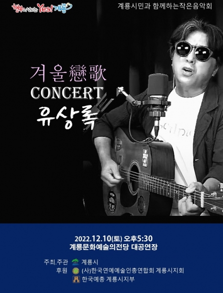이번 음악회는 한국연예예술인총연합회 계룡시지회에서 주관하며 ‘겨울戀歌 CONCERT 유상록’이라는 부제로 7080세대의 유상록 밴드가 함께하는 공연이 펼쳐지며 계룡시 기타연주 동아리 ‘울림하나’가 함께해 공연을 빛낼 예정이다.