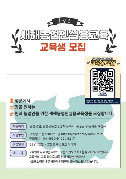 [충청뉴스큐] 홍성군 농업기술센터가 12월 12일부터 ‘2023년 새해농업인실용교육’ 사전신청 접수를 시작한다고 밝혔다.