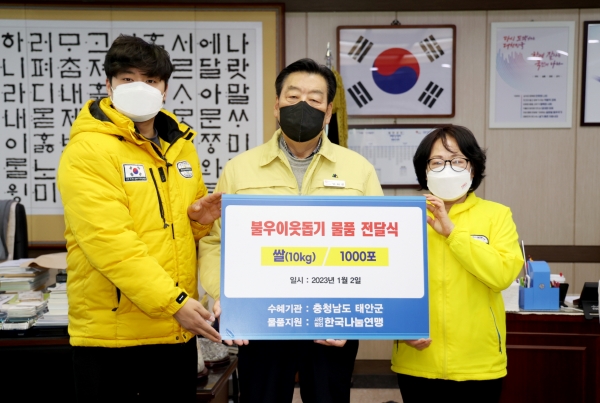 [충청뉴스큐] 한국나눔연맹이 태안군에 ‘사랑의 쌀’을 기탁하며 새해 이웃사랑의 마음을 전했다.