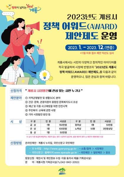 제안 신청은 시정 발전에 관심 있는 계룡시민이면 누구나 참여 가능하며 국민신문고 시 누리집, 시청 방문 등을 통해 접수하면 된다.