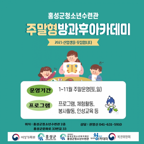 피기용 청소년수련관장은 “홍성 청소년의 주말 돌봄을 지원해 코로나19 이후 변화한 양육환경에 따른 돌봄 공백을 최소화하겠다”며 “앞으로 청소년의 건전 육성과 꿈을 응원하기 위해 최선을 다하겠다”고 밝혔다.