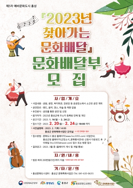 [충청뉴스큐] 홍성문화도시센터·홍성군 문화특화사업단은 ‘2023년 찾아가는 문화배달’사업의 공연자인‘문화배달부’모집을 오는 2월 20일부터 24일까지 접수 받는다.