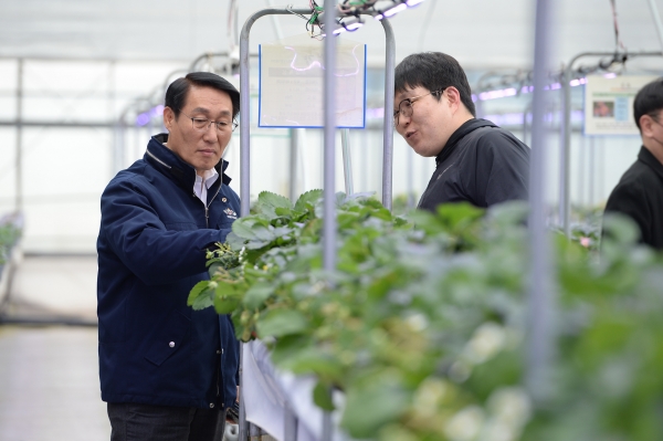 [충청뉴스큐] 이용록 홍성군수가 지난 13일 홍성의 희망으로 불리는 홍희딸기를 개발한 헤테로 영농조합법인과 홍성군농업기술센터에서 실험재배 및 연구를 진행하는 스마트농업 테스트베드 교육장에 방문했다.