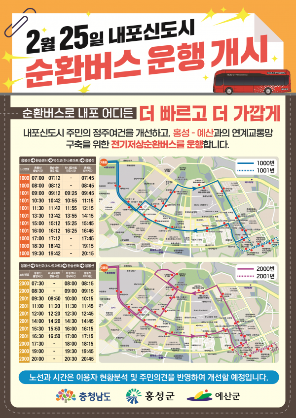 [충청뉴스큐] 홍성군은 내포신도시 내 동일 생활권을 공유하고 있는 지역주민들에게 교통 편의를 제공하고 신도시 활성화를 도모하기 위해 오는 2월 25일부터 내포신도시 순환버스를 개통한다고 밝혔다.