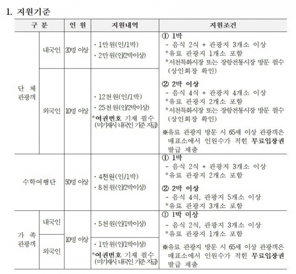 인센티브는 최소 1박 이상 숙박과 인원수, 식당·관광지 등 기준에서 정한 요건을 충족해야 지급되며 요건 충족 시 1인당 최소 4000원에서 최대 2만 5000원까지 지원된다.