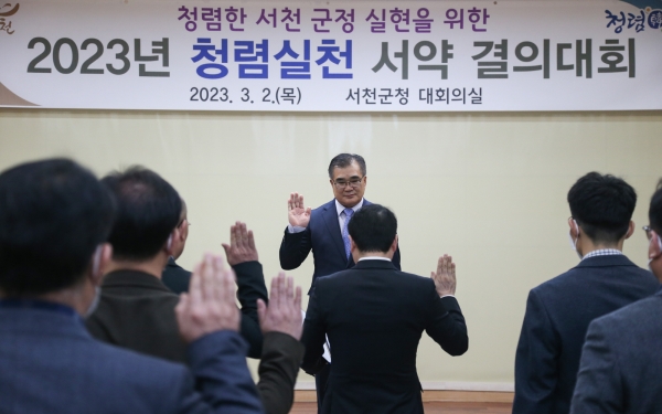 [충청뉴스큐] 서천군이 3월 월례아침모임에서 청렴한 공직문화 조성을 위한 ‘2023년 청렴실천 서약 결의대회’를 갖고 청렴 의지를 다졌다.